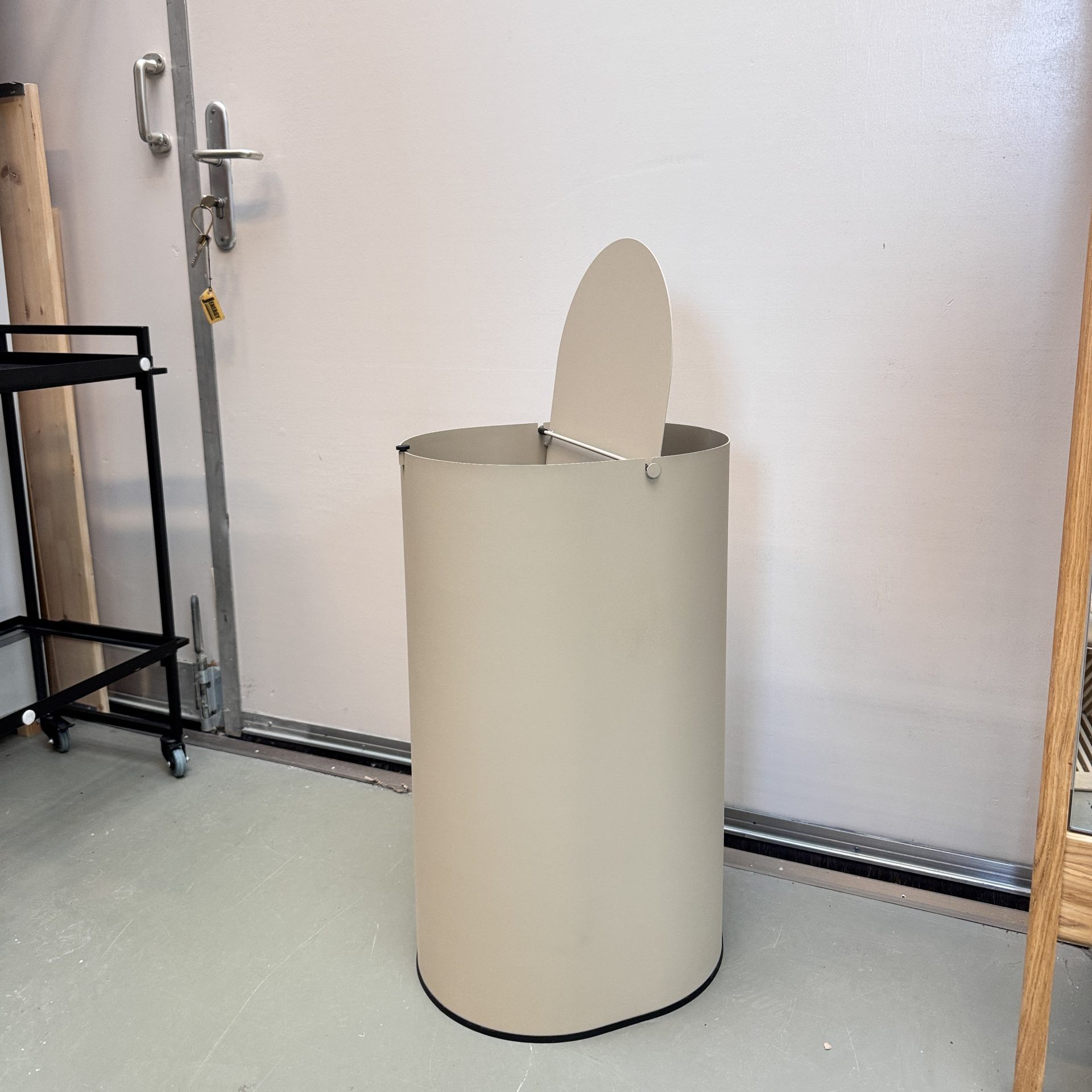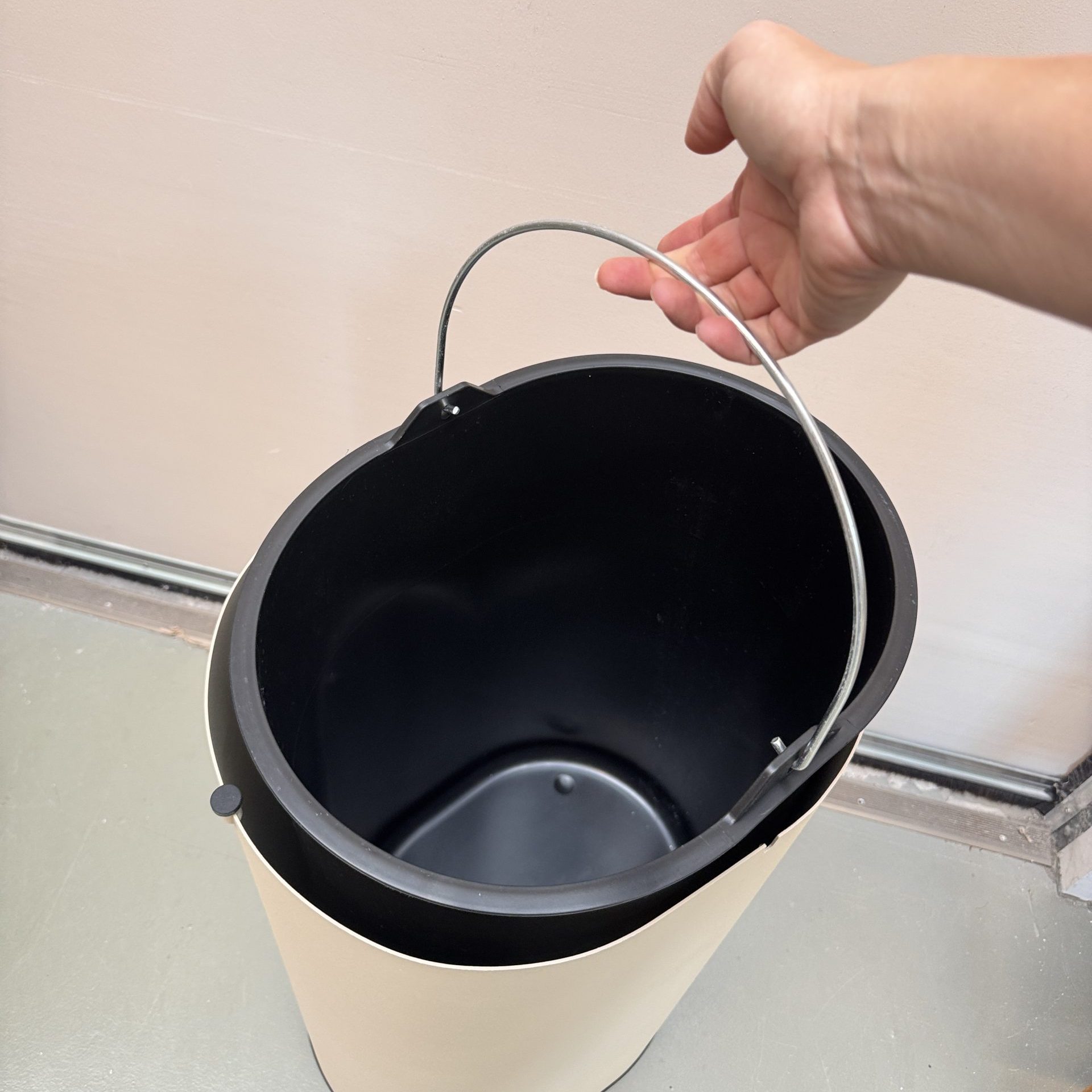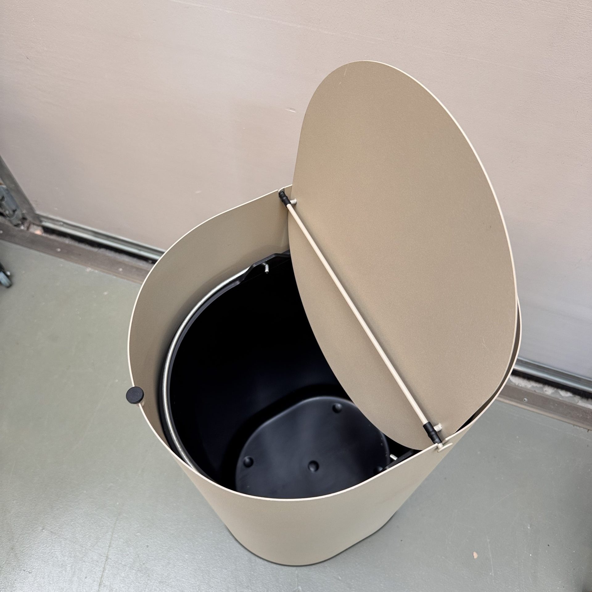 - Materiaal: gepoedercoat koolstofstaal, binnenemmer van gerecycled kunststof met metalen handvat
