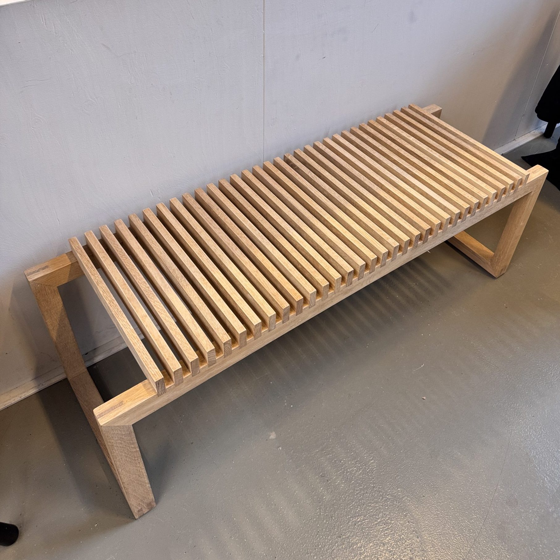 Let op: dit is een nette showroommodel: De bijzondere eikenhouten Cutter bank van Fritz Hansen Skagerak heeft een zitting van rechtopstaande latjes, die op hun plek worden gehouden door een eenvoudig, maar stevig geraamte. De grafische vorm maakt het tot een luchtig ontwerp dat in elke ruimte tot zijn recht komt. Het teakhouten bankje kan ook als tuinbank worden gebruikt!