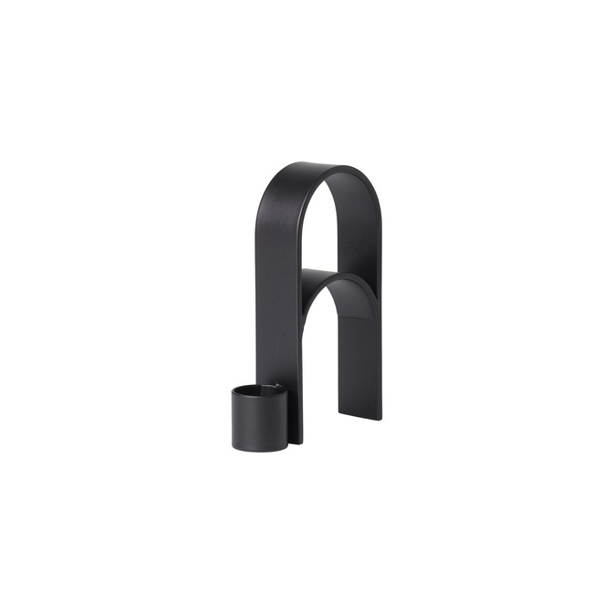 Deze no-nonsense kandelaar is uitgevoerd in matzwart gepoedercoat staal of helder roestvrij staal. Aan de eenvoudige boog is een houder bevestigd waar je een kaars in kunt zetten – maar dat hoeft niet.